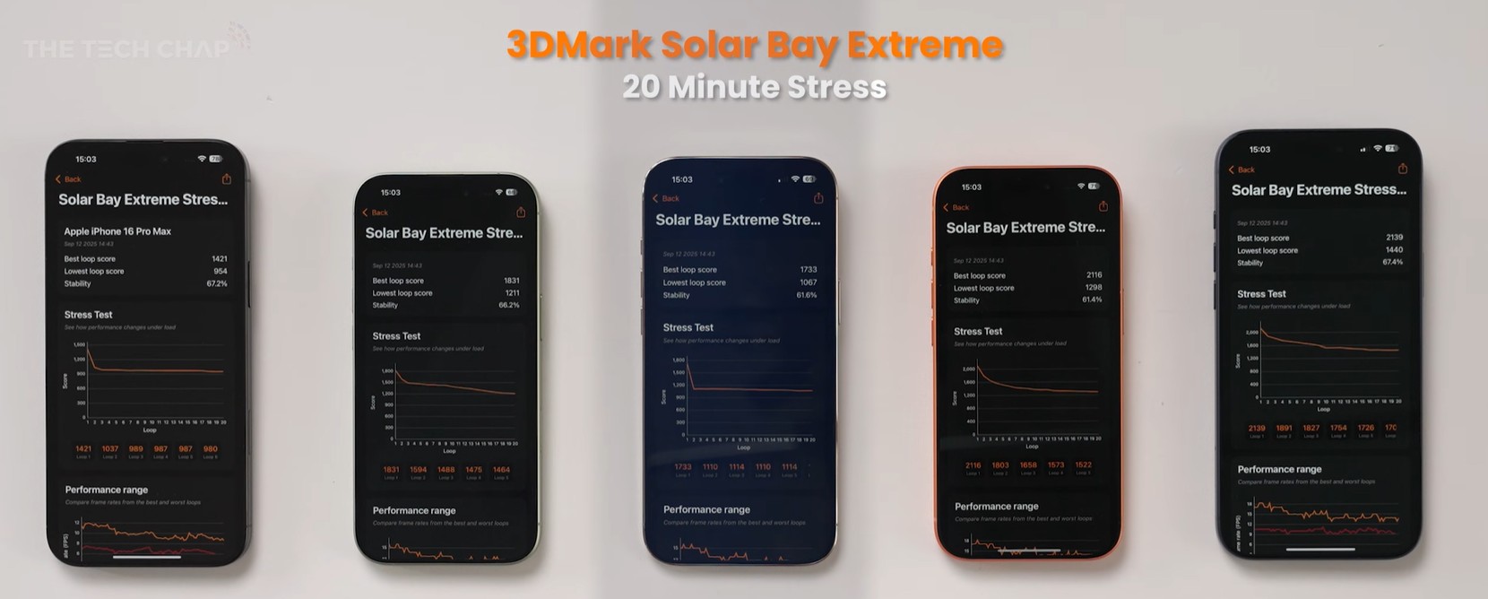 人気YouTuber「The Tech Chap」が行った3DMark Solar Bay Extremeストレステストによると、iPhone 17 Proの安定性スコアは61.4%にとどまりました。一方で、無印のiPhone 17はA19チップ搭載ながら66.2%を記録し、Proモデルを上回る結果となっています。