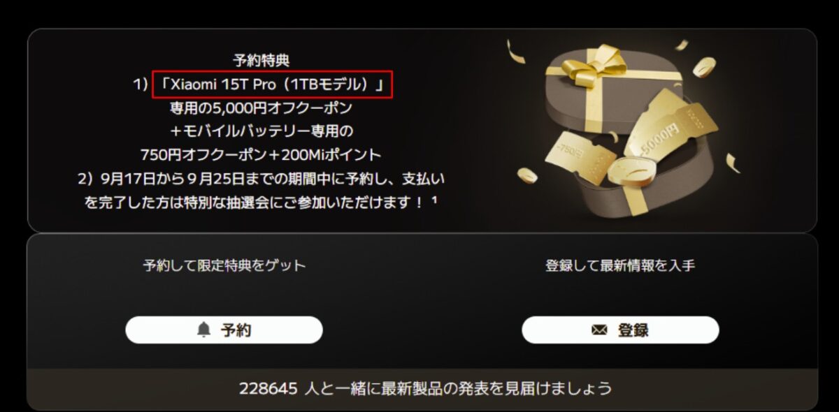 同社の公式サイト上で公開された限定クーポンの案内により、「Xiaomi 15T Pro」に1TBストレージモデルが存在することが判明しました。具体的には、1TB版の購入者を対象に5,000円分の割引クーポンが提供されると記載されており、誤って内部情報が公開されてしまった形です。