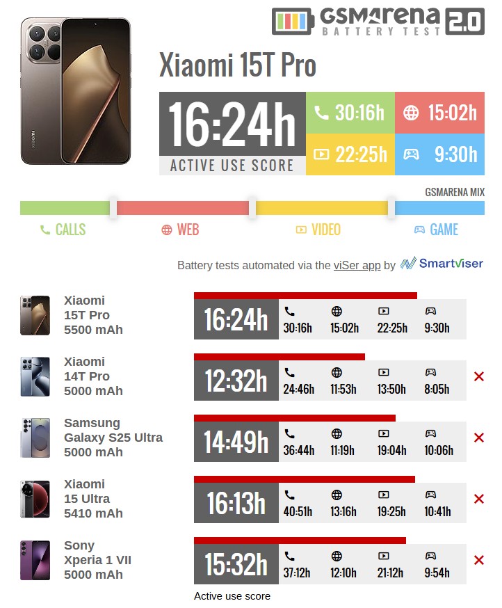 GSMArenaが実施した自動化バッテリーテスト(viSerアプリ/SmartViser使用)で、Xiaomi 15T Pro(5,500mAh)が「Active use score」16時間24分を記録し、比較対象の中ではトップとなりました。テストは通話/ウェブ/動画/ゲームの各用途ごとに計測されており、15T Proはとくに動画再生とウェブブラウジングで群を抜く結果を出しています。