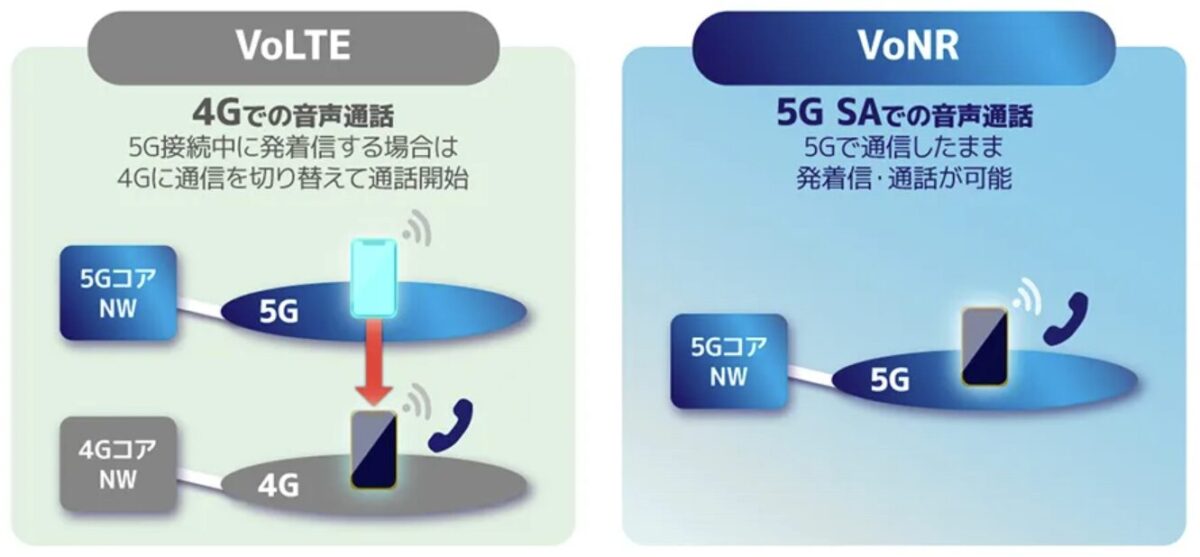 今回の商用化により、SA構成下ではVoNRに対応した端末であれば、5G回線のまま音声通話が可能になります。