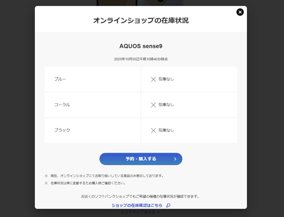 現在、ソフトバンクオンラインショップでは「AQUOS sense9」が全3色とも在庫なしとなっています。