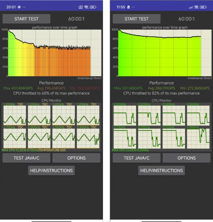ご覧のように、Xiaomi 15T Proではテストを開始してしばらくするとパフォーマンスがピーク時の60%程度まで低下しています。