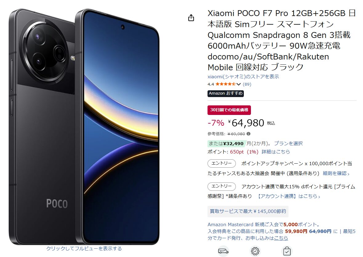 以下はPOCO F7 Pro 256GBのアマゾンでの記事執筆時点での価格で、参考価格から7%オフの64,980円で販売されています。