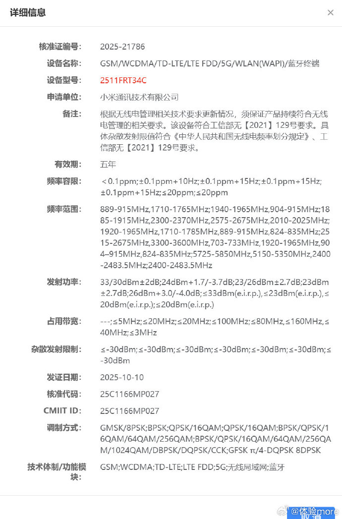 中国の認証機関「3C」には、型番「2511FRT34C」としてRedmi Turbo 5が登録されており、発売準備が着々と進んでいることが確認されています。リーク情報によれば、このモデルは11月にも中国で正式発表される見通しです。