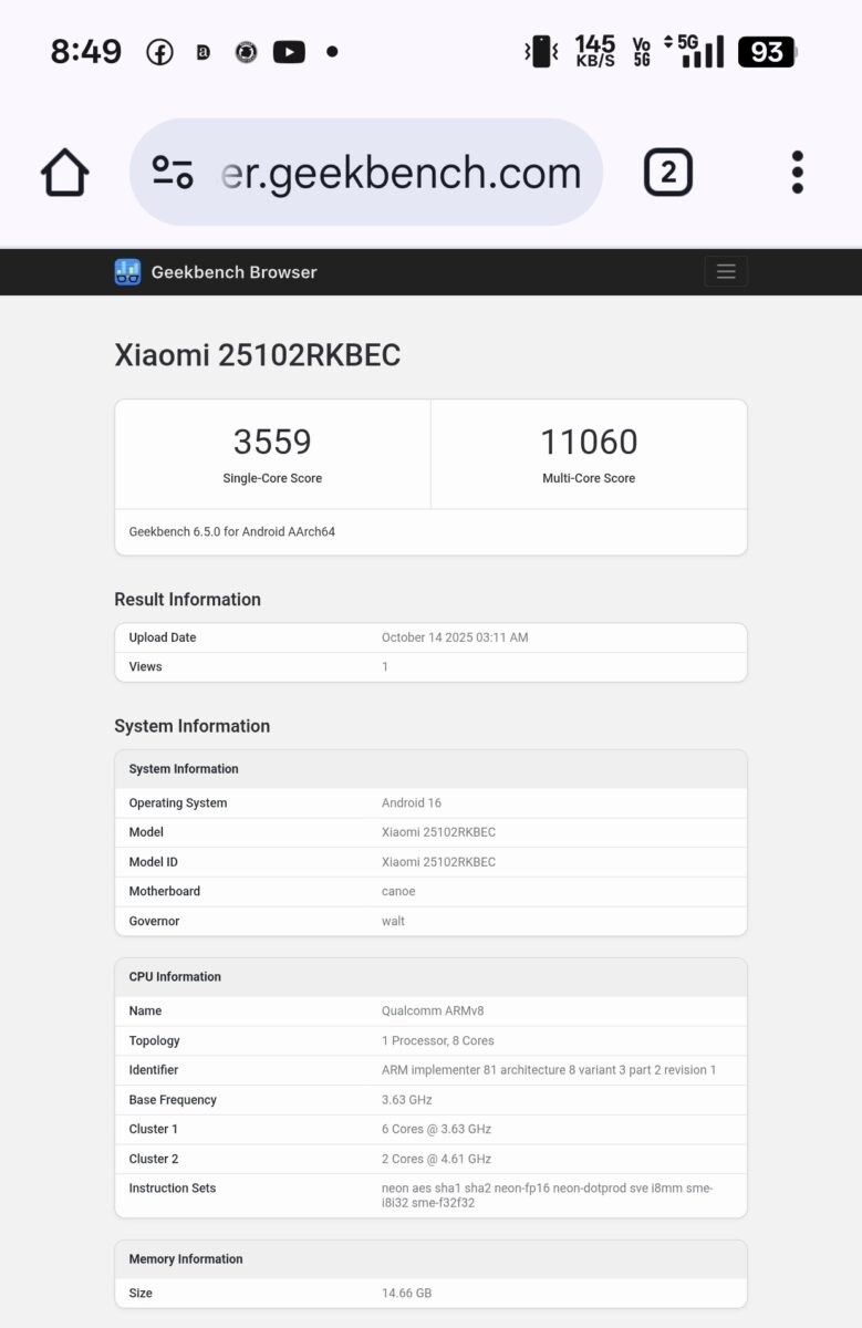 同端末はシングルコアで3,559点、マルチコアで11,060点という非常に高いスコアを記録。CPU構成は3.63GHz駆動の6コアと、4.61GHz駆動の2コアを備え、GPUにはAdreno 840を搭載していることがソースコードから判明しています。これにより、最新のSnapdragon 8 Elite Gen 5チップセットが採用されていることが事実上確認されました。
