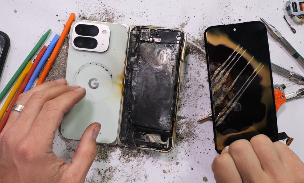 Googleの最新フォルダブルスマートフォン「Pixel 10 Pro Fold」が、YouTubeチャンネル「JerryRigEverything」の耐久テスト中にバッテリー爆発を起こしたことが話題になっています。テストの終盤、端末を2度にわたり逆方向に折り曲げた際に発火したもので、内部のバッテリーが物理的に損傷したことが原因とみられています。