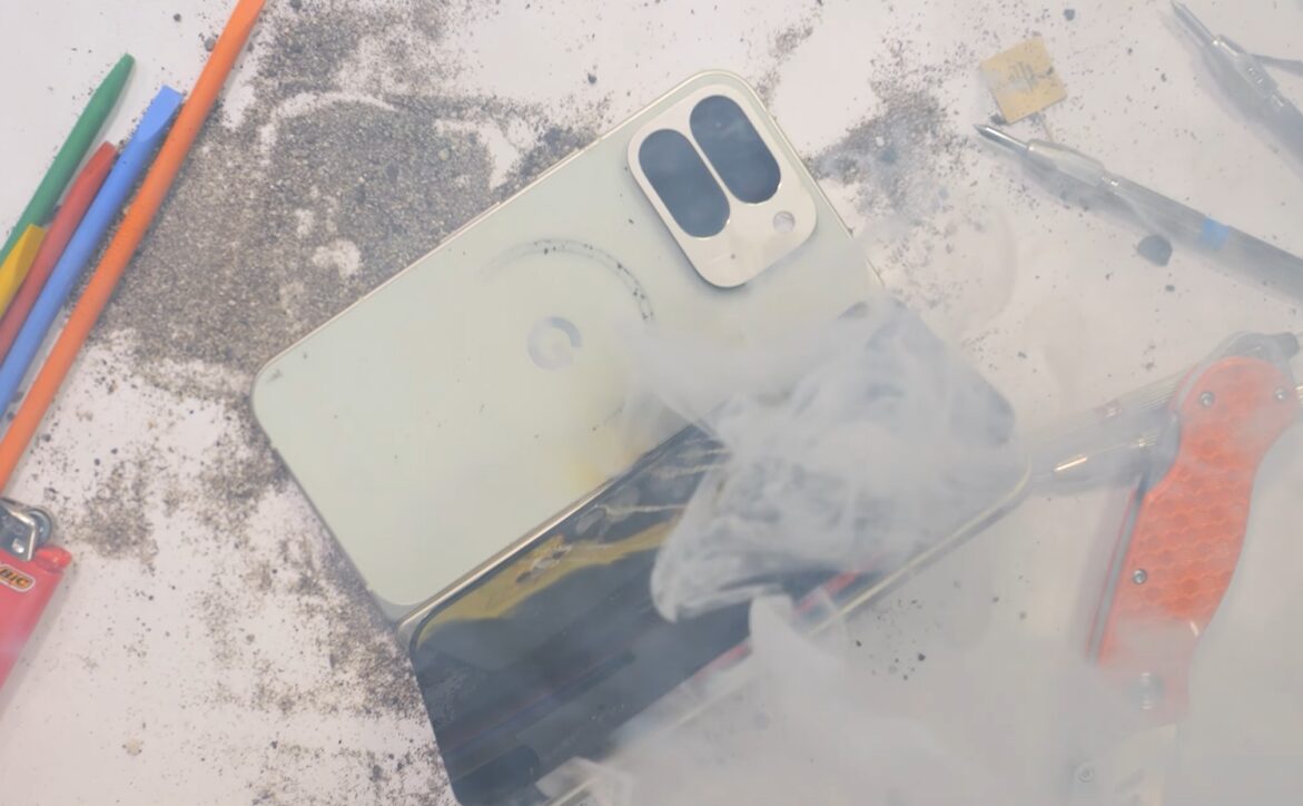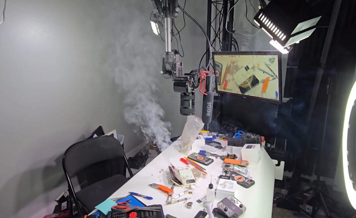 結果、端末は大きく変形し、内部バッテリーが圧迫されて発火。これまで多数のスマートフォンが同様のテストを受けてきましたが、バッテリーが実際に爆発したのは今回が初めてとのことです。JerryRigEverythingの運営者も「過去に何百台もテストしてきたが、こんなことはなかった」と驚きを隠せない様子でした。