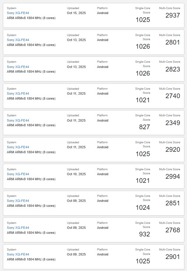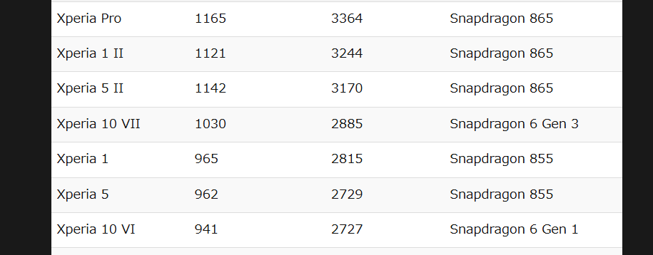 一方、以下は過去のXperiaを含むXperiaスマートフォンのベンチマークスコア一覧の一部。