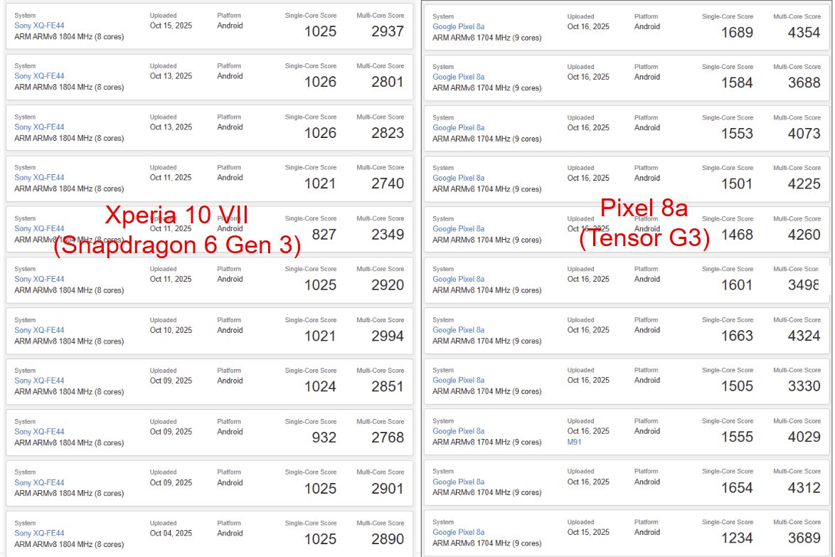 そして以下はXperia 10 VIIとPixel 8aのGeekbenchにおけるベンチマークスコアの比較: