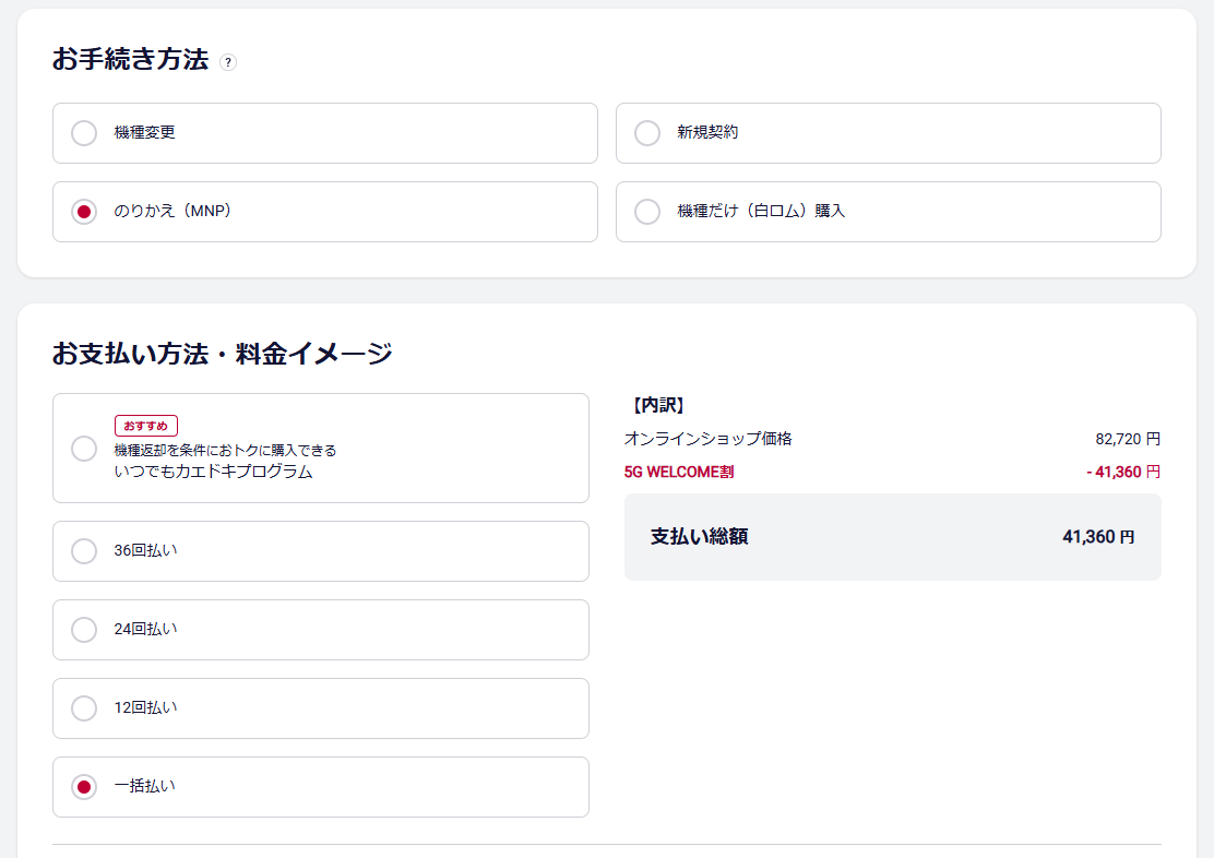 ドコモ版Xperia 10 VIIの端末価格は82m720円ですが、MNPで購入の場合は5G WECOME割が適用され、41,360円の割引が適用されます。