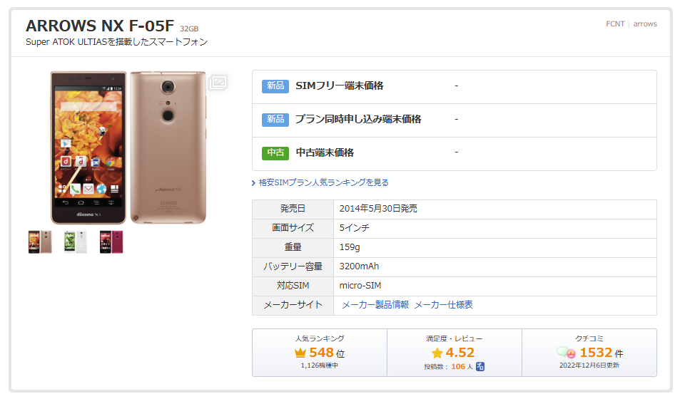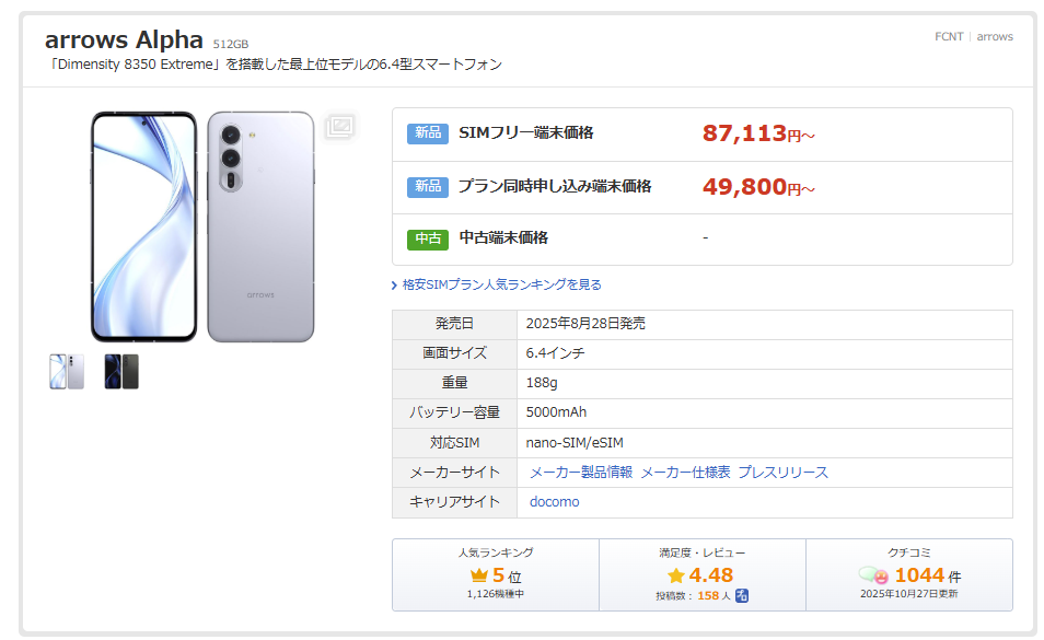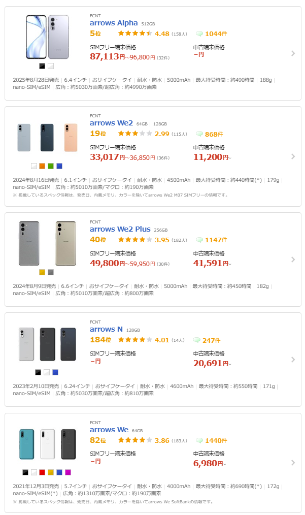 なお、Arrowsスマートフォンが価格.comで今回のarrows Alpha以上の総合評価を得たのは2014年発売のARROWS NX F-05Fが最後で、この頃のArrowsスマートフォンはまだ富士通が展開していました。