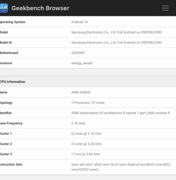 興味深い点として、先週にはクロックスピードが抑えられた別バージョンのExynos 2600もGeekbenchに掲載されました。こちらはCortex-X930が3.55GHz、パフォーマンスコアが2.96GHz、効率コアが2.46GHzで動作し、スコアはシングル3,047点、マルチ10,025点と一段低い結果になっています。