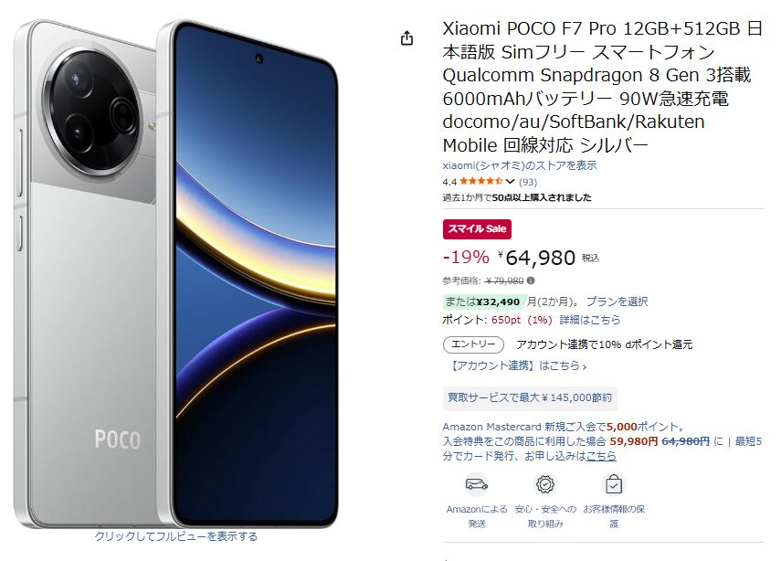 以下はamazonに掲載されているPOCO F7 Proの12GB+256GB。