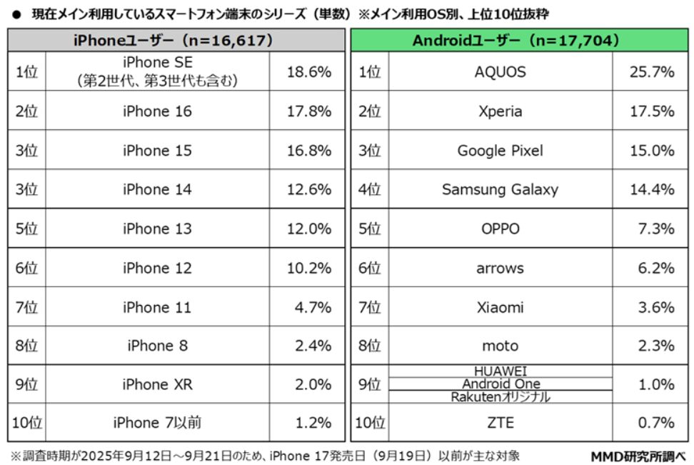 国内のAndroidスマートフォン市場で、この1年の間に明確な勢いの差が生まれつつあります。MMD研究所が2025年9月時点で実施した最新調査によると、主要ブランドのユーザー比率には大きな変化が見られました。