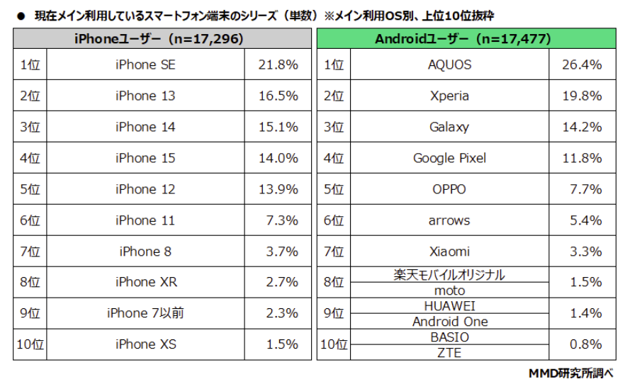3位には Google Pixel(15.0%) がランクイン。2023年頃から台頭が続いていましたが、今回の結果でも勢いは衰えていません。