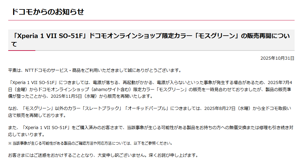 NTTドコモは10月31日、電源が落ちる・再起動する・起動しなくなる可能性があるとして販売を一時停止していた「Xperia 1 VII SO-51F」の限定カラー「モスグリーン」について、販売再開を発表しました。販売は 11月5日(水)18時から ドコモオンラインショップ(ahamoサイト含む)にて行われます。