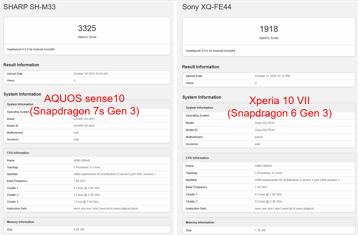 最大の違いといえばやはり搭載チップセットで、Xperia 10 VIIがSnapdragon 6 Gen 3搭載なのに対し、AQUOS sense10はSnapdragon 7s Gen 3を搭載しています。両者の性能比較については後述します。