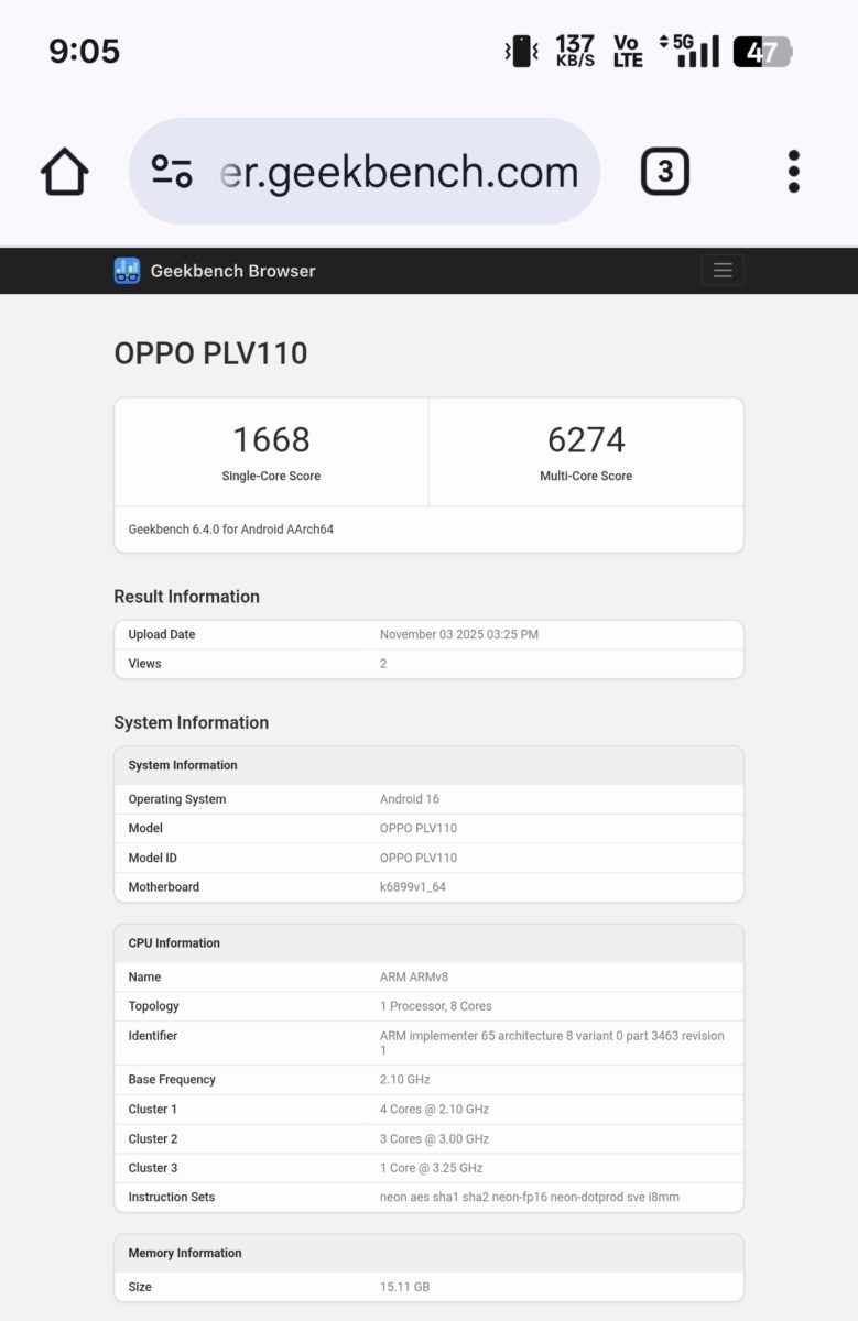 海外のリーカー・Abhishek Yadav氏が、Geekbench上に未発表のOppo端末を発見しました。型番は「PLV110」。正式名称は明記されていませんが、Reno 15の中国向けモデルと見られるとしています。