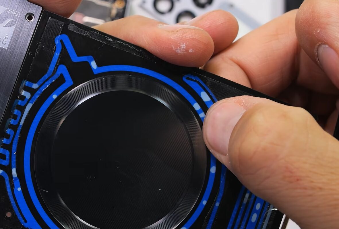 背面ガラスを取り外すと、透明背面から見えていた2色のクーラント(冷却液)が循環するチューブが登場します。冷却液には視覚的な流動感を出すため、オイルのような成分が混ぜられている可能性があるとのことです。
