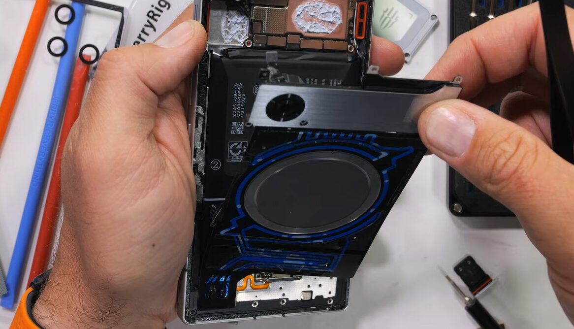 興味深いのは、AquaCore Cooling System、ピエゾ式マイクロポンプ、アクティブファン、ワイヤレス充電コイルなどがひとつの部品として丸ごと外れる点です。内部には柔軟なチューブが走り、液体がプロセッサ周辺を循環しながら熱を逃がす仕組みになっています。