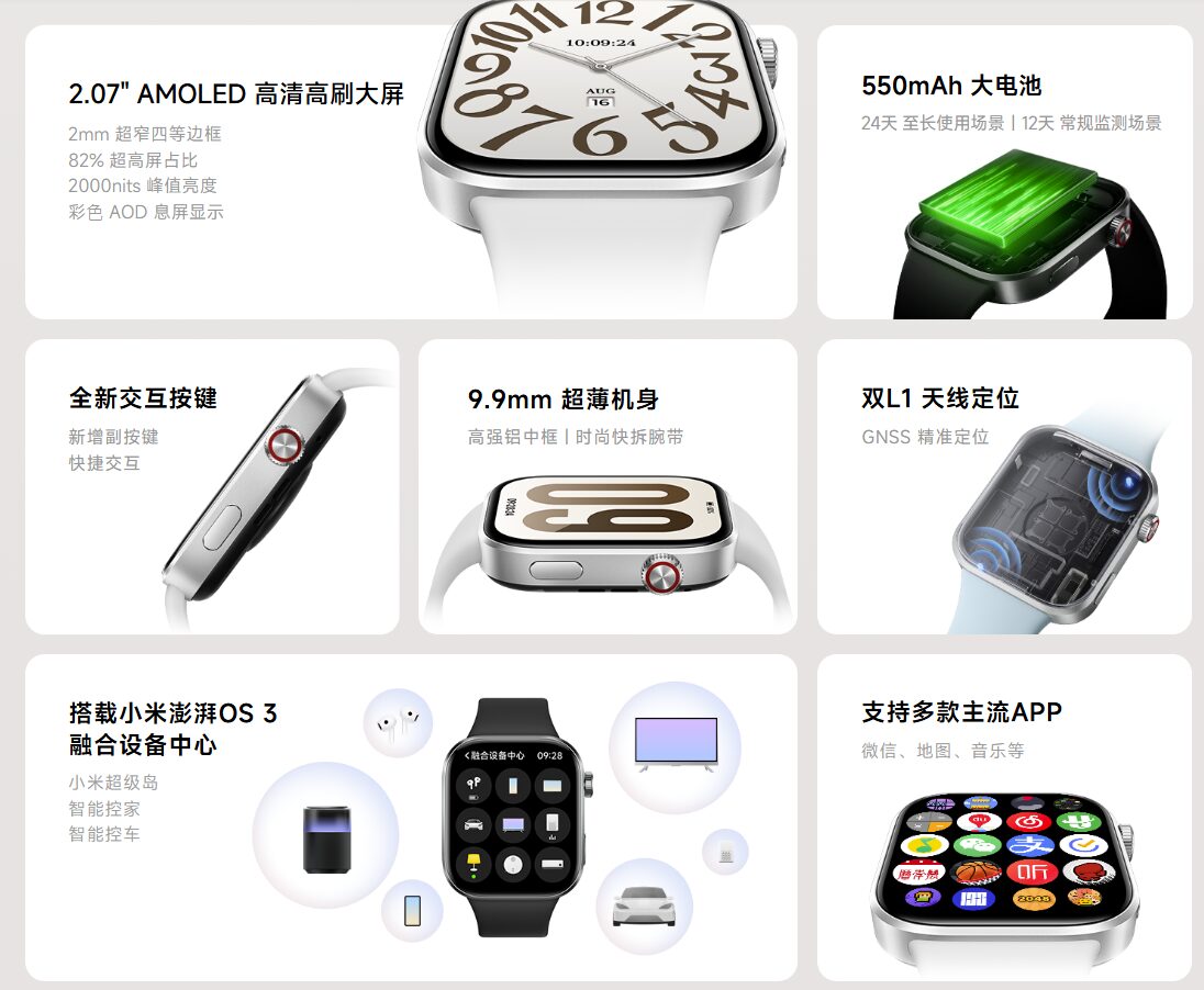 ソフトウェアは最新のHyperOS 3を採用。Bluetooth 5.4でスマートフォンと連携でき、NFCやQRコードを使った決済、バス・車のデジタルキーにも対応します。WeChatのクイック返信にも対応し、Flightradar24やミニゲーム(2048)など、サードパーティアプリによる拡張性も用意されています。一方で、eSIMモデルは現時点で発表されていません。