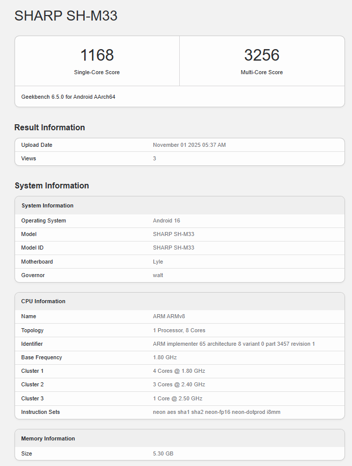 以下はGeekbench上で発見されたシャープ製の未発表モデル「SM0C5」のベンチマークスコア。