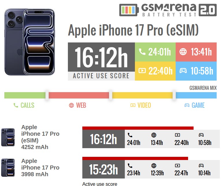 実際、「iPhone 17 Pro」のeSIM版は4,252mAh、物理SIM版は3,998mAhと、その差は約6.35%。Appleは発表時点で「動画再生が最大2時間伸びる」と紹介しており、バッテリー持ちが気になるユーザーにとって期待できる要素となっていました。