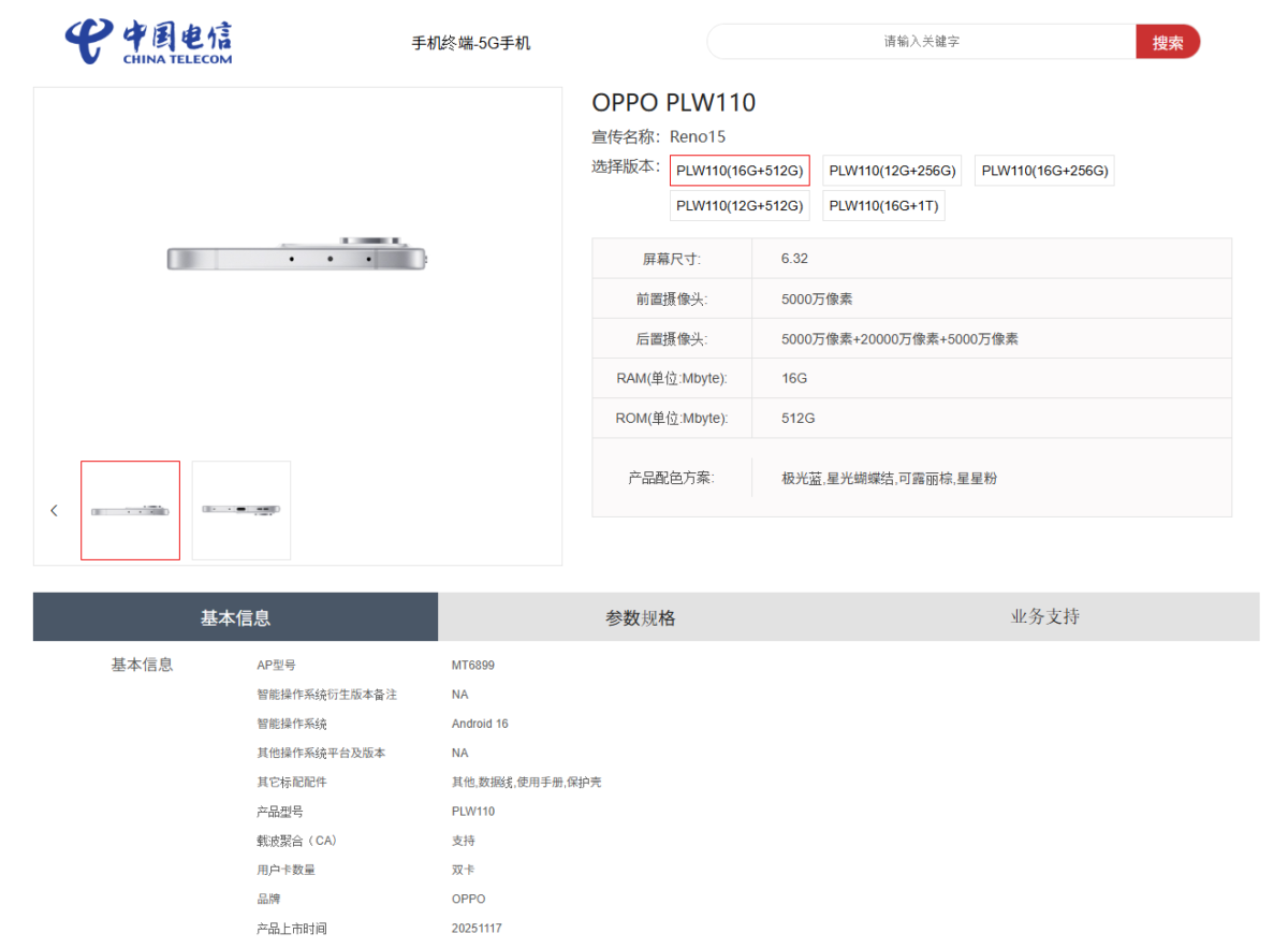 Oppoが11月17日に中国で発表する新型「Reno15」シリーズについて、未公開だったスペック情報が一気に明らかになりました。デザインやカラーバリエーションはすでにティザー公開されていましたが、今回は中国電信(China Telecom)のデータベースに掲載された内容から、ハードウェアの詳細が判明しています。