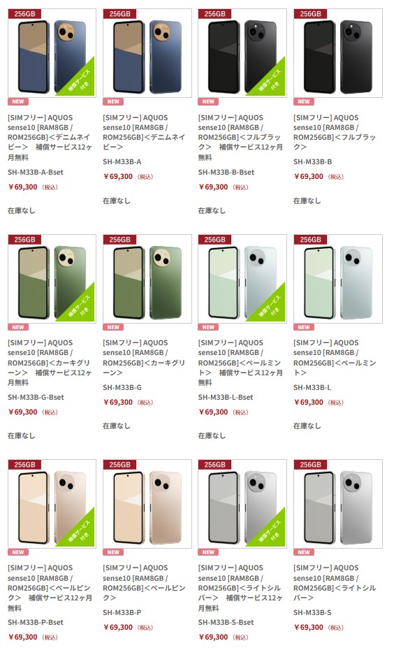 以下は当記事執筆時点でのシャープ公式ストアのAQUOS sense10 8GB/256GBモデルの販売ページです。
