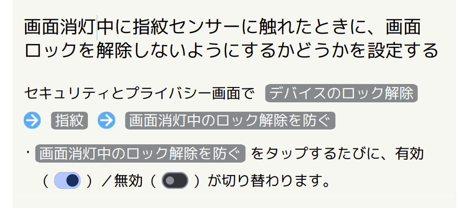 セキュリティとプライバシー画面→デバイスのロック解除→指紋→画面消灯中のロック解除を防ぐ