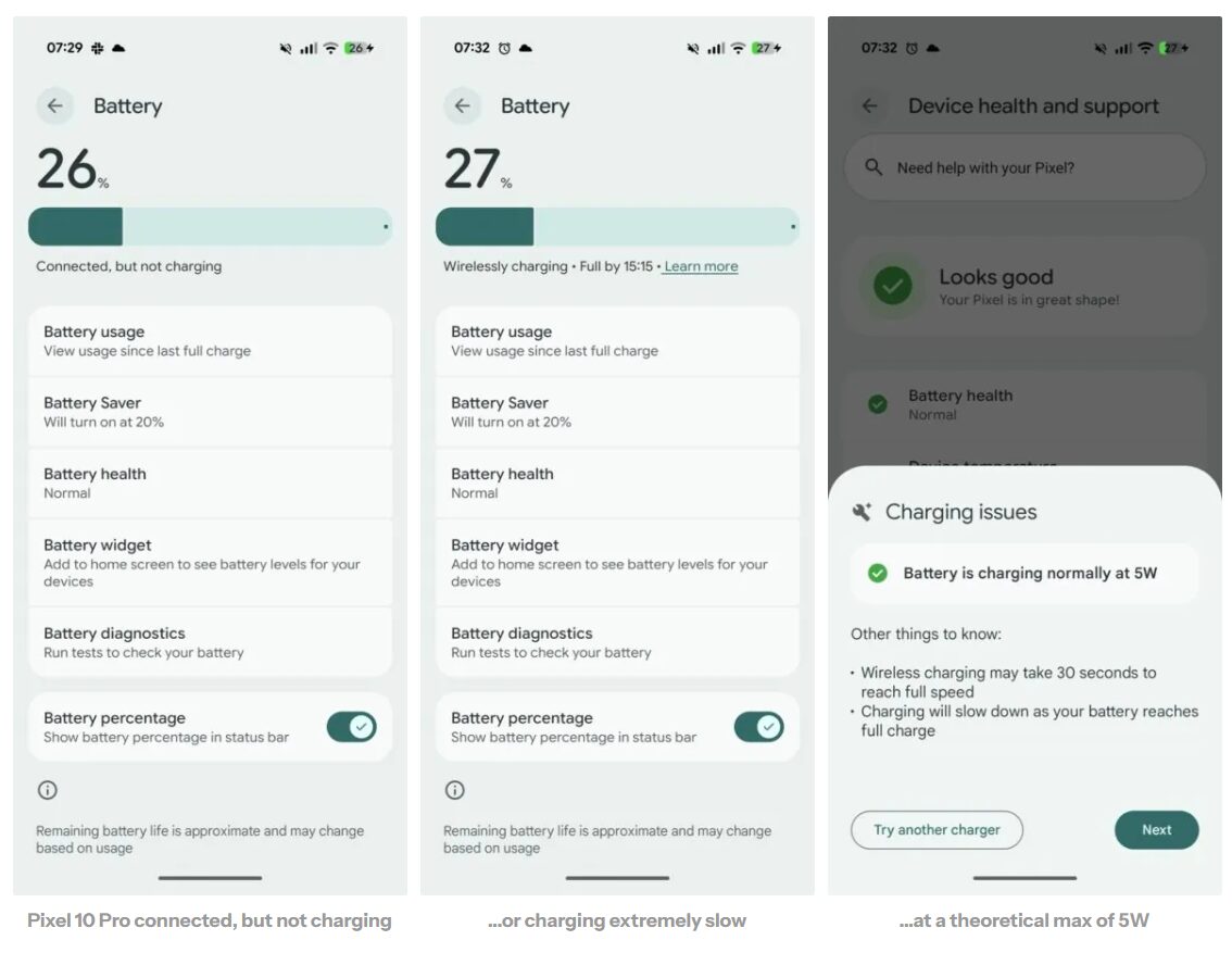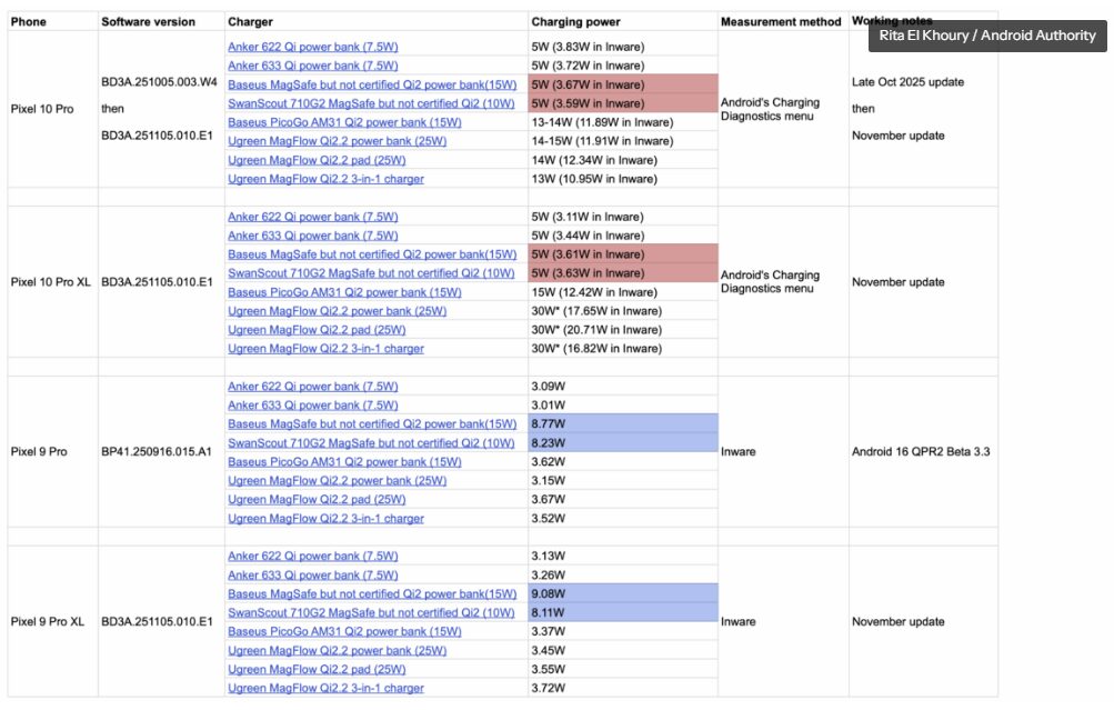Android Authorityのテストでも、Pixel 9シリーズでは12W近く出せていた同じ充電器が、Pixel 10では3〜5Wしか出ないという結果が確認され、端末側の仕様変更による影響が強く疑われています。