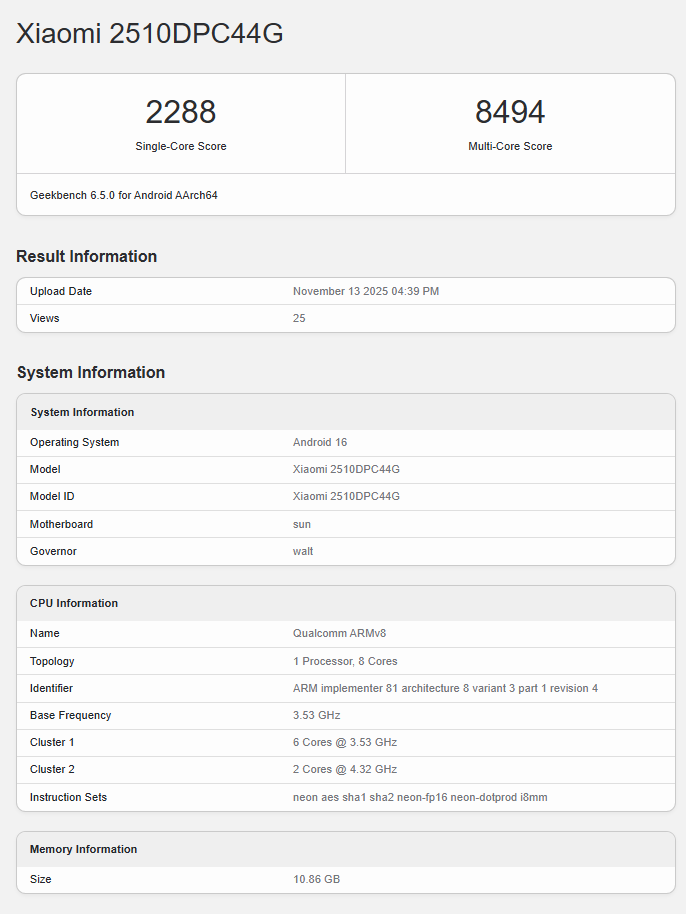 F8 UltraはすでにGeekbenchに登場していましたが、今回、新たに「Xiaomi 2510DPC44G」という型番でF8 Proと思われる端末が同プラットフォームに登録されました。