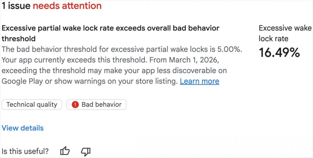 今回の変更で中心となるのが、Android Vitalsに追加される新しい指標「excessive partial wake locks(過剰な部分的ウェイクロック)」です。アプリが画面OFFの状態でも端末をスリープさせず動作し続ける時間を測定し、その量が一定基準を超えると“問題あり”と判定されます。