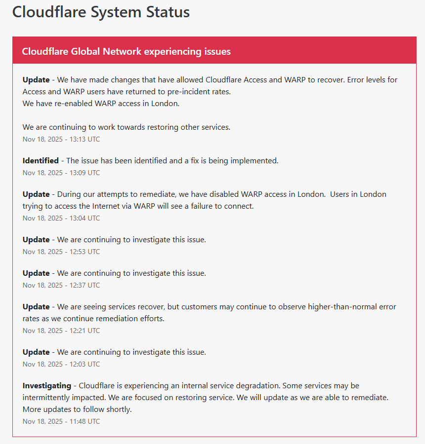 Cloudflareはこの障害を把握しており、公式のステータスページで状況の更新を続けています。障害は断続的に発生しているようで、一時的に接続できるサイトもあるものの、根本的な解決には至っていない状況です。