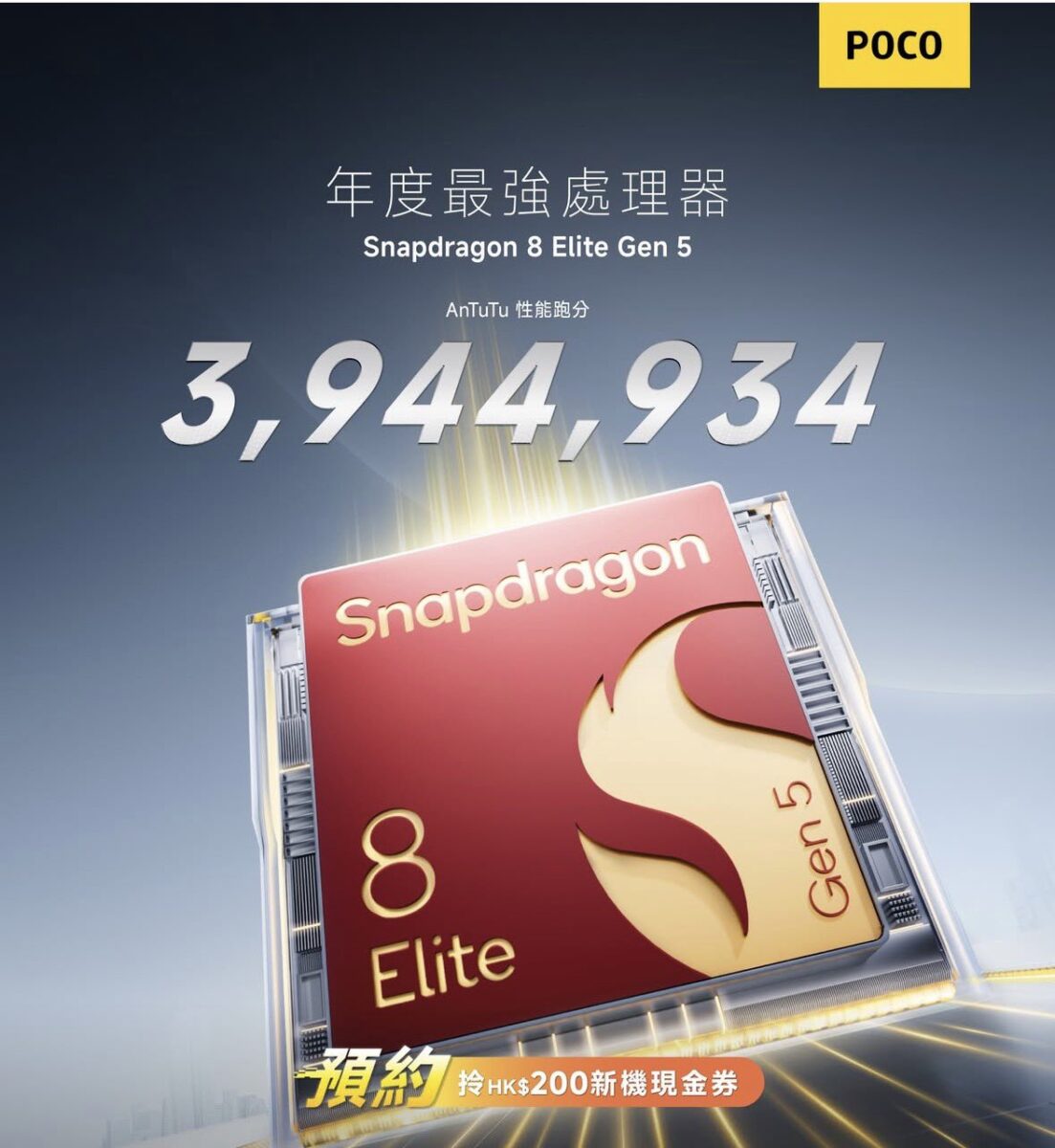 Poco F7 Ultraの後継として登場するPoco F8 Ultraは、最新のSnapdragon 8 Elite Gen 5を採用します。このチップは前世代から大きく性能を伸ばしており、Xiaomiが公開したAnTuTuスコアは3,944,934点。