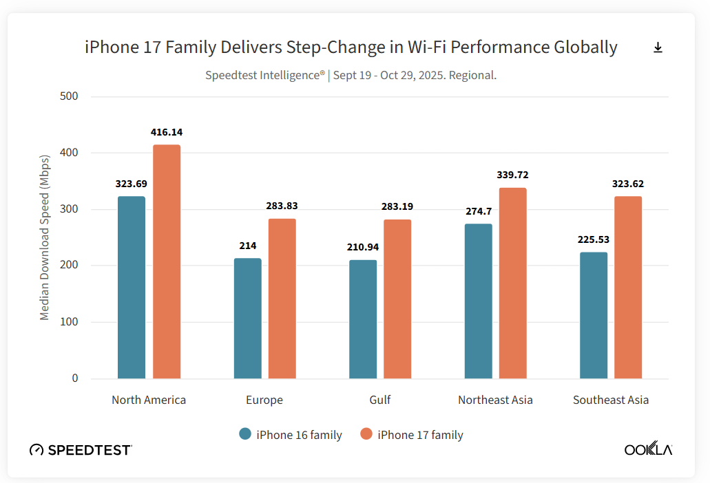 北米では、iPhone 16の平均ダウンロード速度が約323Mbpsだったのに対し、iPhone 17は416Mbpsを記録。およそ40%の改善となり、体感にも影響しそうな差です。