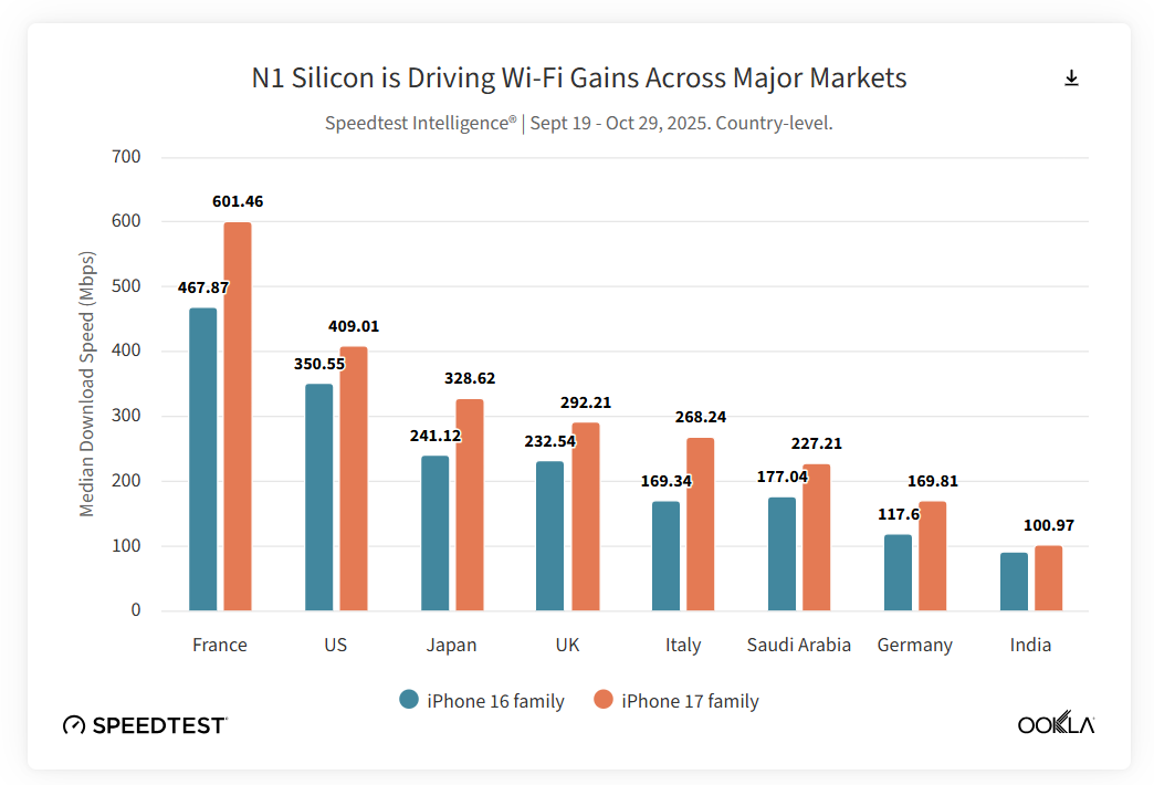 iPhone 17シリーズで採用されたApple独自設計の通信チップ「N1」。このN1チップが、Wi-Fi速度を大きく押し上げていることが、通信計測サービスを手がけるOoklaの最新レポートで判明しました。