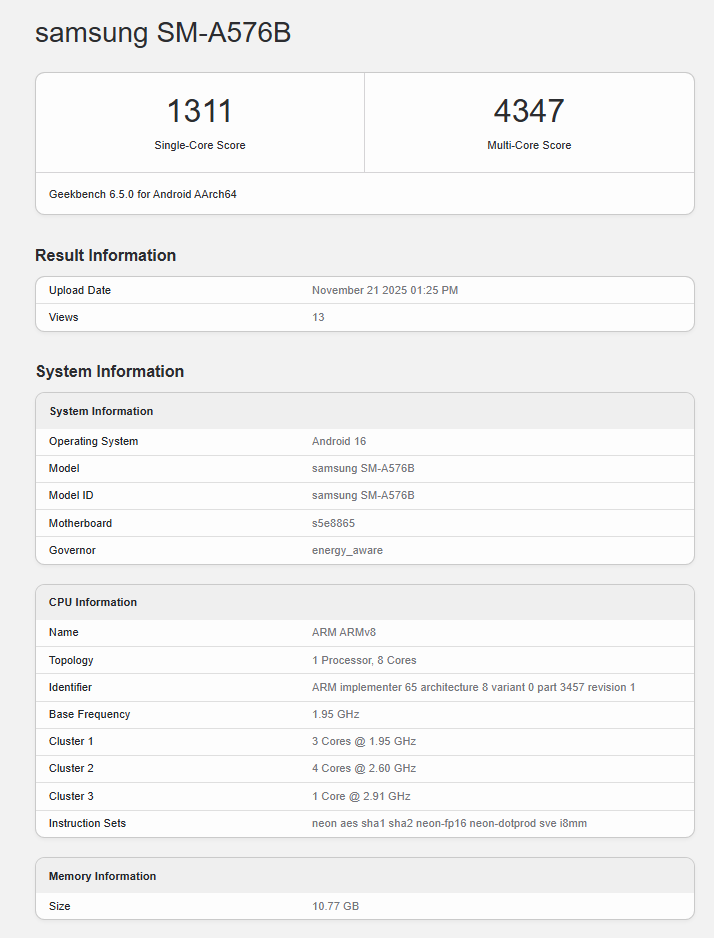 Geekbenchの情報によると、Galaxy A57は「S5E8865」というチップセットを採用しており、これがExynos 1680のコードネームである可能性が高いとされています。RAMは12GBが搭載され、前モデルと比較してマルチコア性能は約10%向上しているとのことです。一方で、シングルコア性能は4%ほど低く表示されていますが、これはまだ開発中のソフトウェアによるものと見られます。