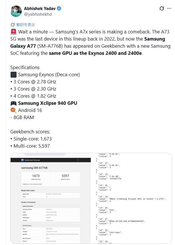 Samsungのミドルレンジ「Galaxy A7x」シリーズが約3年ぶりに戻ってくるかもしれません。新型と思われる「Galaxy A77」がGeekbenchに出現し、これまでのAシリーズとは一線を画す性能を示しています。