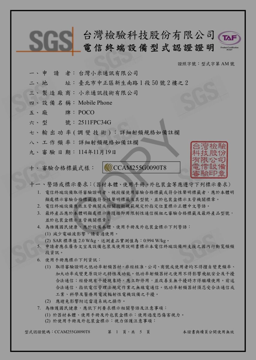 新型スマートフォン「POCO X8 Pro」が、SGSの認証データベースに登録され、その内容からバッテリー仕様が明らかになりました。掲載されていた型番は「2511FPC34G」で、これにより同機種が6500mAhの大容量バッテリーと100W急速充電に対応することが確認されています。