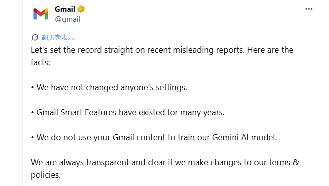 一部メディアもこの情報を取り上げたため、誤解はさらに拡大。これを受け、GoogleはGmail公式X(旧Twitter)アカウントを通じて以下の趣旨をコメントしています。
