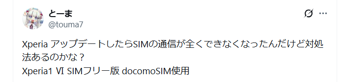 Twitter上では、「アップデート後にモバイル通信が全くできなくなった」「通信が安定せず認証できない」「初期化しても直るか分からない」といった投稿が相次いでおり、ハッシュタグ「#Xperia1vi」などで状況を共有する動きも見られます。