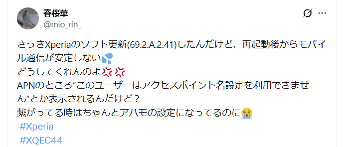 あるユーザーは、アップデート後に端末を再起動するとモバイル通信が途切れたり、APN設定に「このユーザーはアクセスポイント名設定を利用できません」と表示される状態になったと報告しています。通信が回復しても、再び切断されることがあり、ドコモメールの認証などにも支障が出ているとのことです。