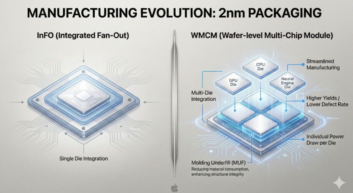A20世代で大きく変わるのが、チップの「パッケージング方式」です。従来採用されてきたInFO(Integrated Fan-Out)に代わり、A20シリーズではWMCM(Wafer-level Multi-Chip Module)が導入される見通しです。