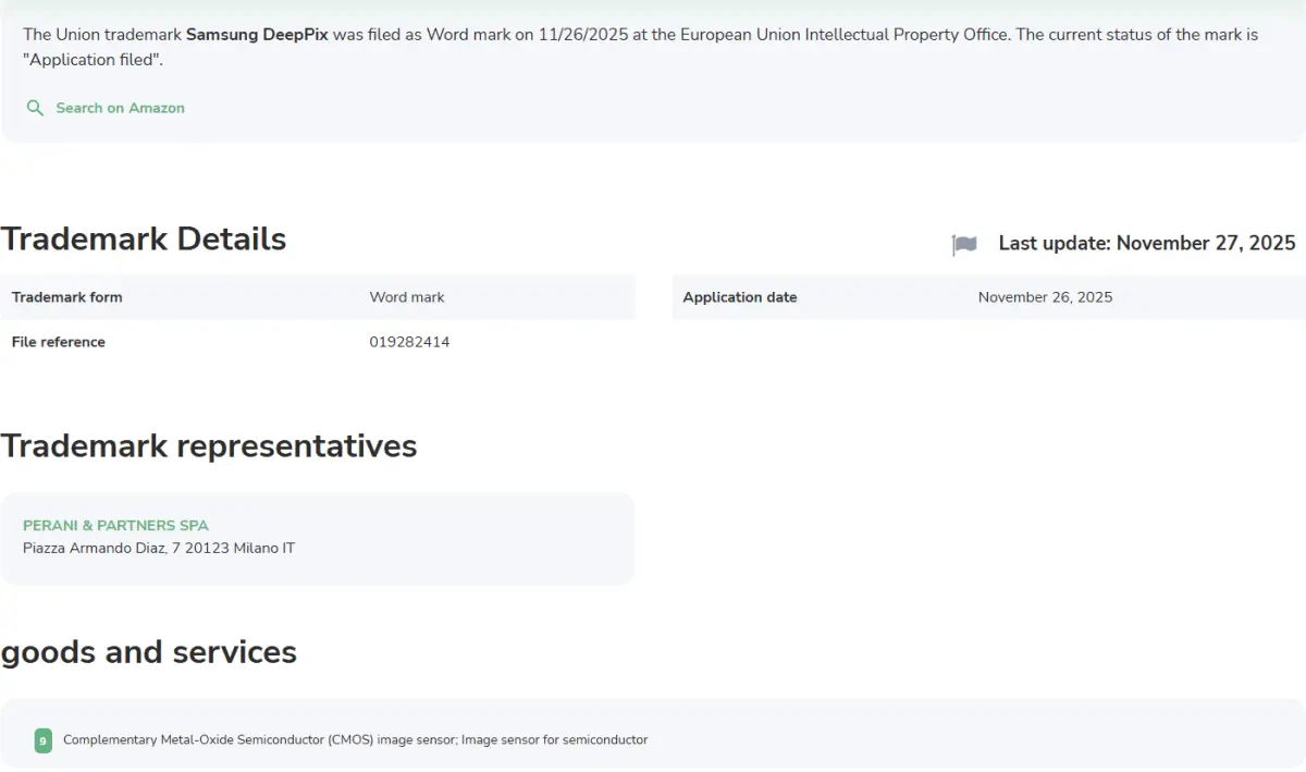 「Samsung DeepPix」はアルゼンチン、欧州、米国で商標出願されており、書類には“CMOSイメージセンサー”として記載されています。名称から想像されるソフトウェア機能やカメラ効果ではなく、純粋に新しいハードウェアとして扱われる見込みです。
