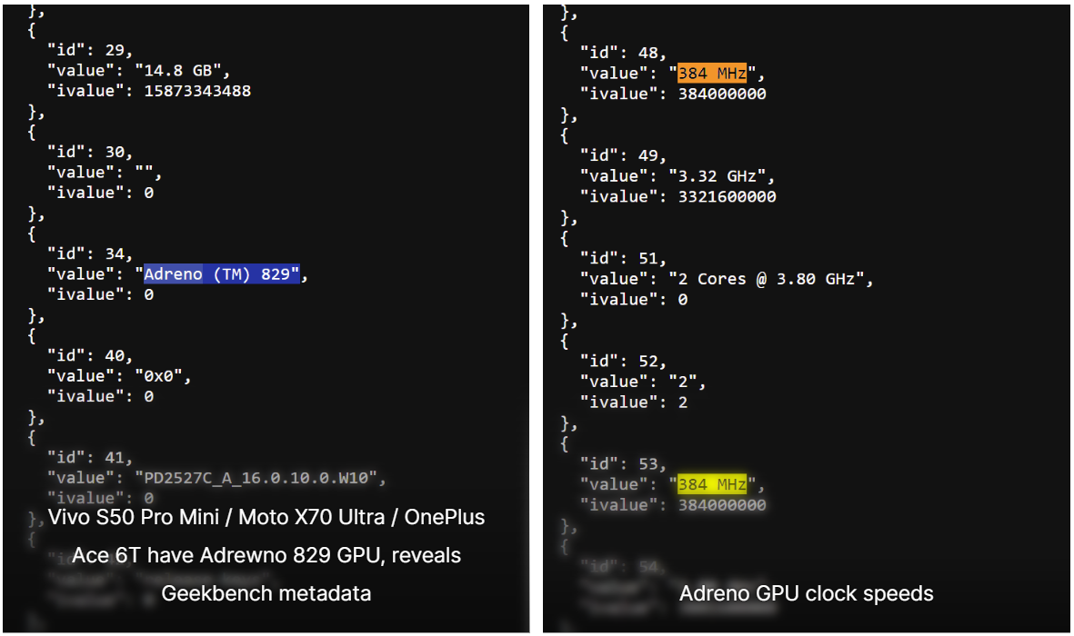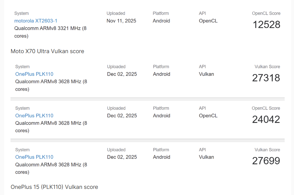 複数の実機テストが登場し始め、ようやくその違いが見えてきました。たとえば Moto X70 Ultra(Snapdragon 8 Gen 5搭載)がGeekbenchのOpenCLテストを実行した結果、GPUクロックは384MHzと記録されています。