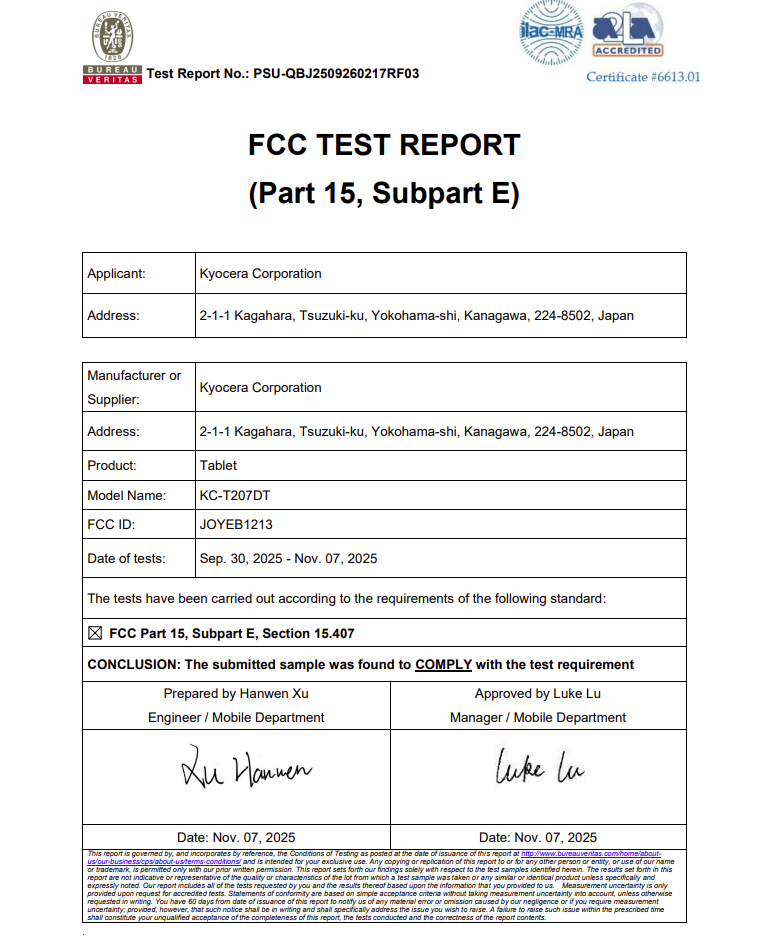 京セラ製の未発表タブレットが米国のFCC認証を通過していたことが確認されました。