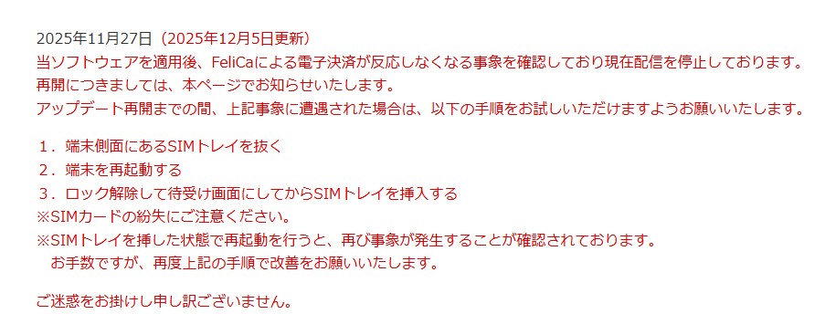 ソニーは11月27日付けの案内(12月5日更新)で、Android 16更新後にFeliCaが反応しなくなる事象を確認したとして、該当アップデートの配信を停止したと発表しました。再開時期については、あらためて公式ページで案内される予定です。