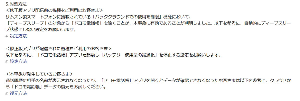 修正版アプリが未配信の機種を利用するユーザーに向けては、端末側の「バックグラウンドでの使用を制限」設定が影響している可能性があるとして、「ドコモ電話帳」をディープスリープ対象から除外する設定が推奨されています。これにより、アプリが自動的に休止状態となることを防ぎ、不具合の発生を抑制できるとしています。