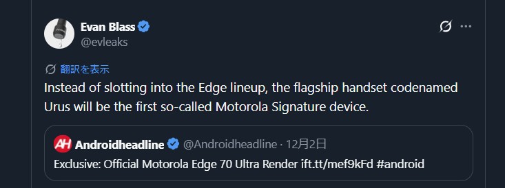 今回の情報を伝えたのは著名リーカーのEvan Blass氏です。同氏によると、開発コードネーム「Urus」と呼ばれていた端末は、既存のEdgeシリーズではなく、全く新しい「Signature」シリーズの第一弾として2026年に発売される可能性が高いとのことです。